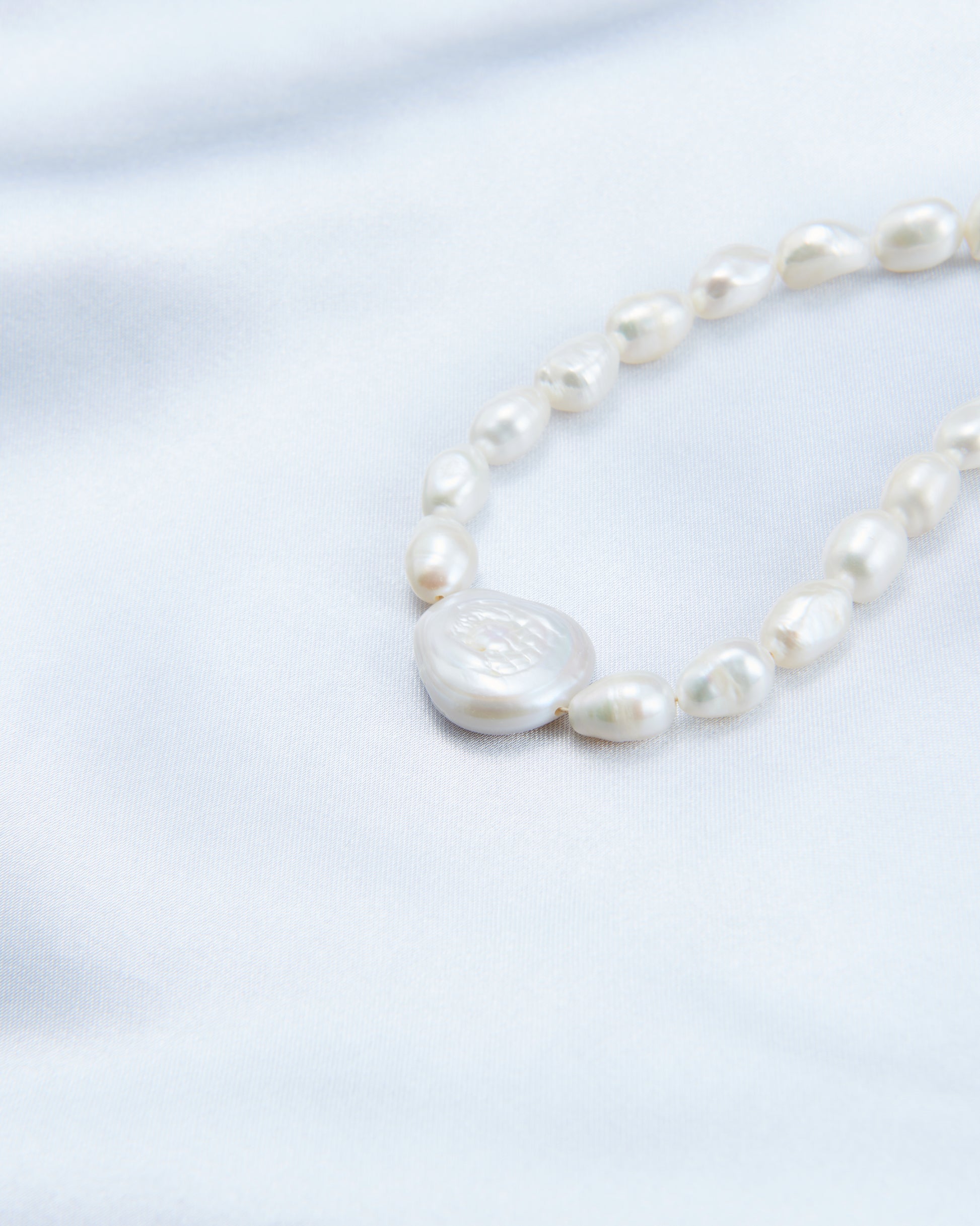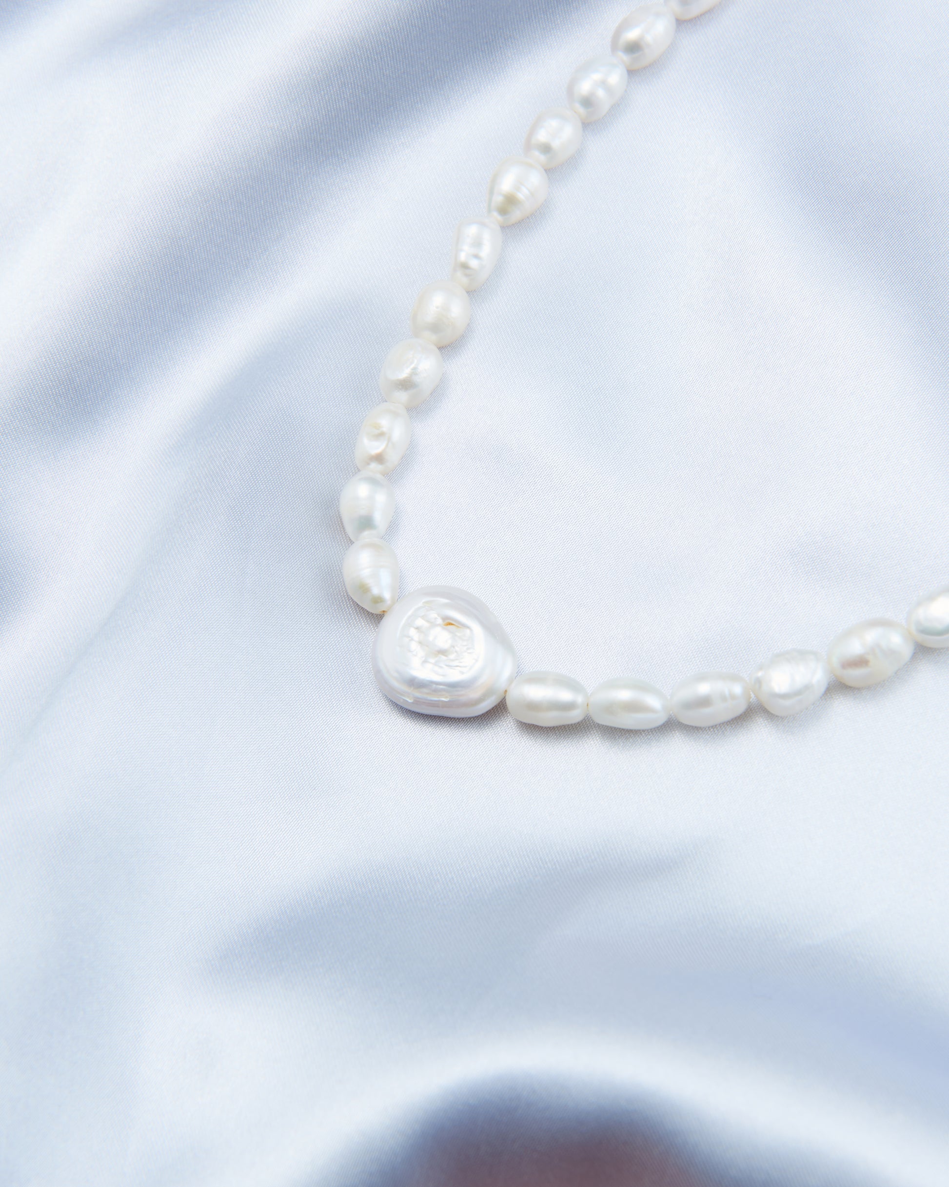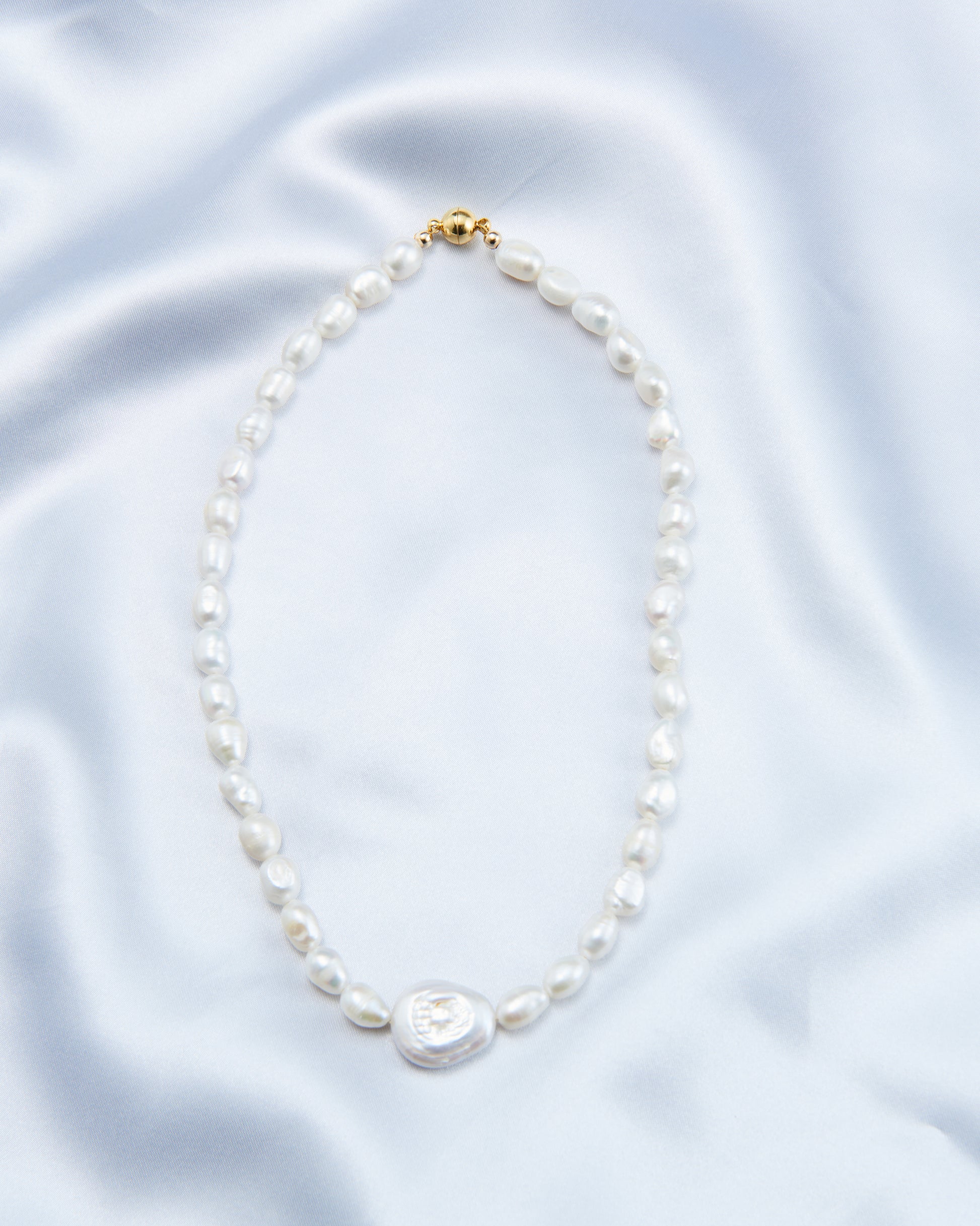 Vintage-inspired baroque pearl necklace evoking 1950s Italian glamour. Sterling silver setting channels classic Hollywood sophistication. Their radiant luster and unique contours bring depth, character, and timeless elegance to this design. This piece is one of a kind, making it a truly special and meaningful gift.